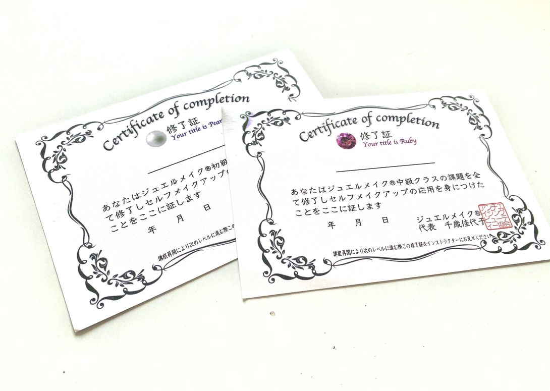 | 受講料(ルビー・エメラルドの修了証をお持ちの方) | ¥132,000- ジュエルメイク®︎クラスレッスンの中級を修了し修了証をお持ちの方は、補講なしで2級インストラクター養成講座をご受講いただけます。 |